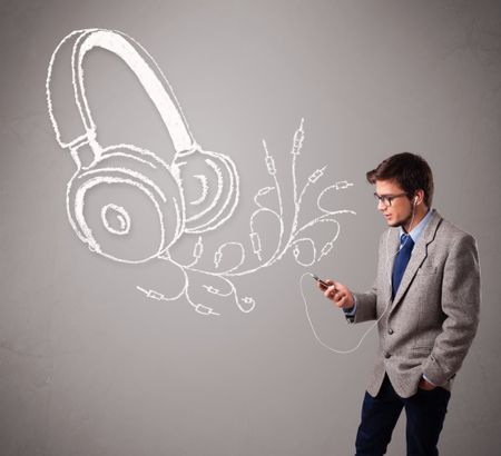 attractive man singing and listening to music with abstract headphone getting out of his mouth