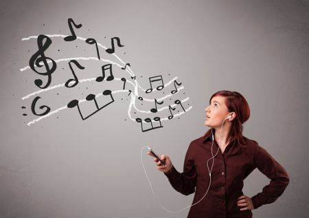 attractive young lady singing and listening to music with musical notes getting out of her mouth