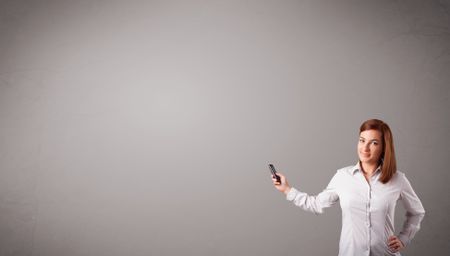 attractive young lady standing and holding a phone with copy space