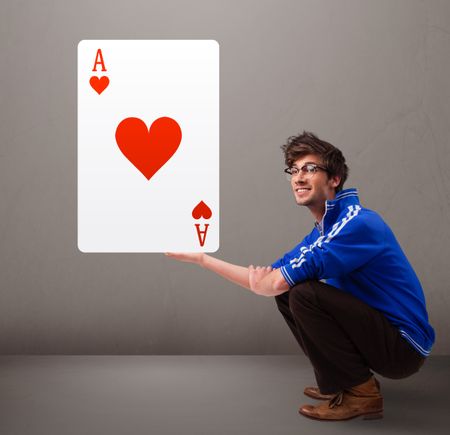 Attractive young man holding a red heart ace