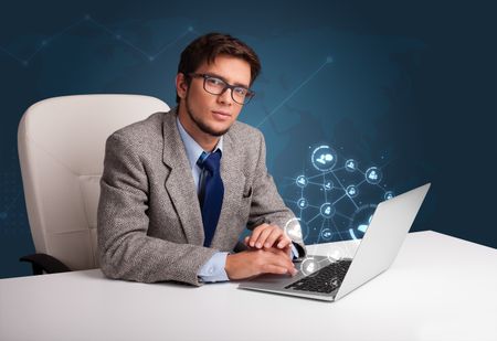 Attractive young man sitting at desk and typing on laptop with social network icons comming out