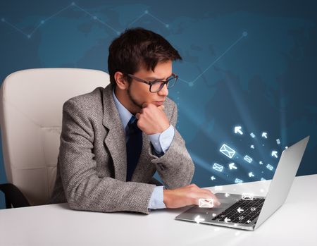 Attractive young man sitting at dest and typing on laptop with message icons comming out