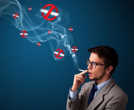 Attractive young man smoking dangerous cigarette with no smoking signs