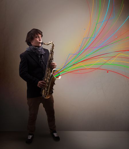 Attractive young musician playing on saxophone while colorful abstract lines exploding