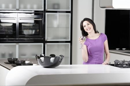 Attractive young woman in a dinner dress holding a glass of wine in her kitchen.