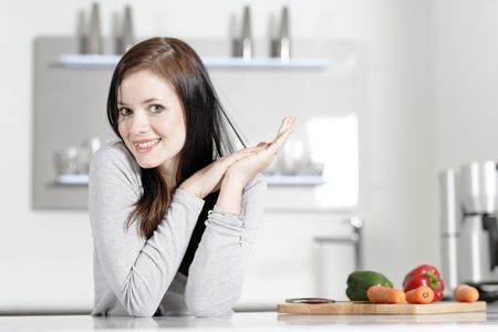 Attractive young woman in her elegant kitchen with fresh vegetables ready to cook.