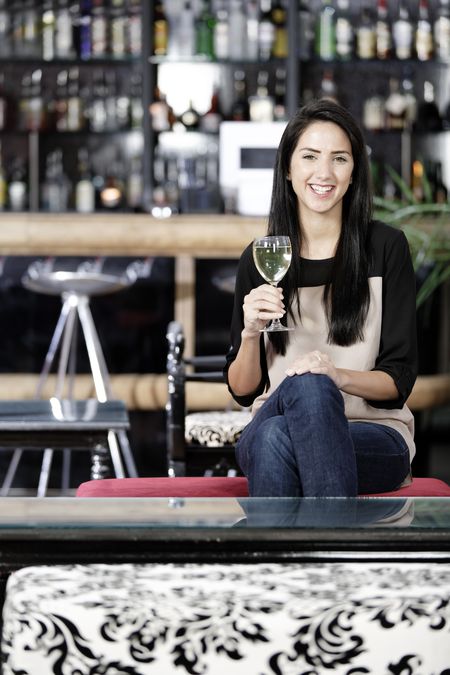 Attractive young woman enjoying a glass of white wine in a wine bar.