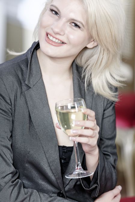 Attractive young woman enjoying a glass of white wine in a wine bar.