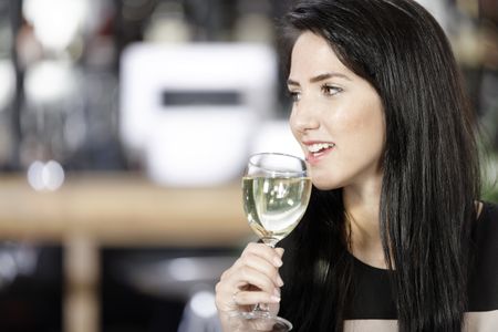 Attractive young woman enjoying a glass of white wine in a wine bar.