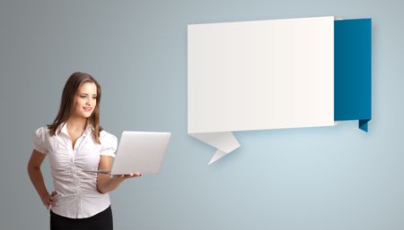 Attractive young woman holding a laptop and presenting modern origami copy space