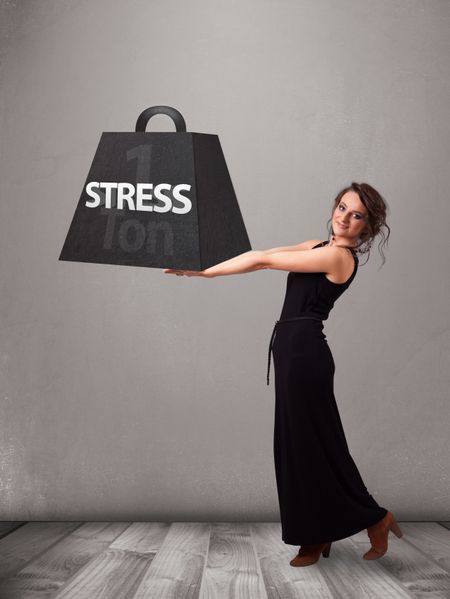 Attractive young woman holding one ton of stress weight