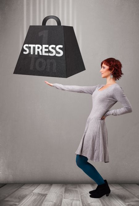 Attractive young woman holding one ton of stress weight