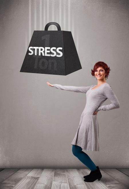Attractive young woman holding one ton of stress weight