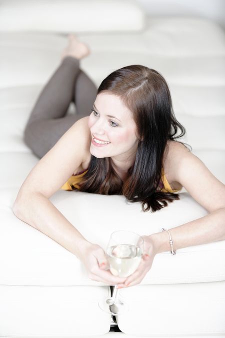 Attractive young woman lying on her sofa enjoying a glass of wine.