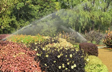Automated watering of formal garden in the morning, Wheaton, Illinois, in mid September