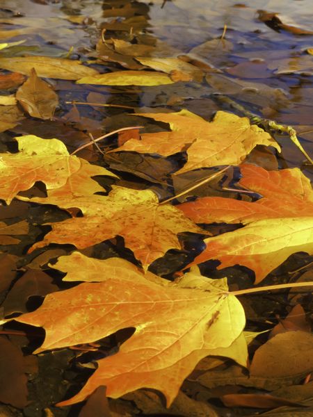 Autumn at a glance: Brilliantly colored maple leaves in puddle