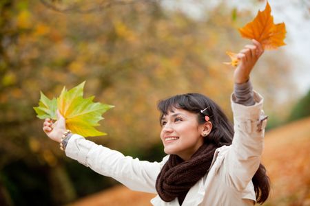 Autumn woman portrait smiling outdoors holding leaves