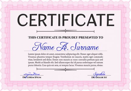 Awesome Certificate template. Award. Money Pattern. With great quality guilloche pattern. Pink color.