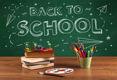 Back to school concepty with writing on blackboard and desk, apple, books, items