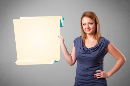 Baeutiful young woman holding white origami paper copy space