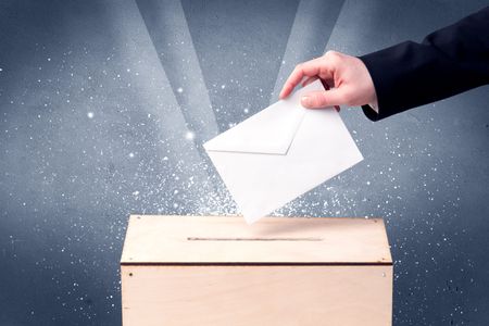 Ballot box with person casting vote on sparkling background