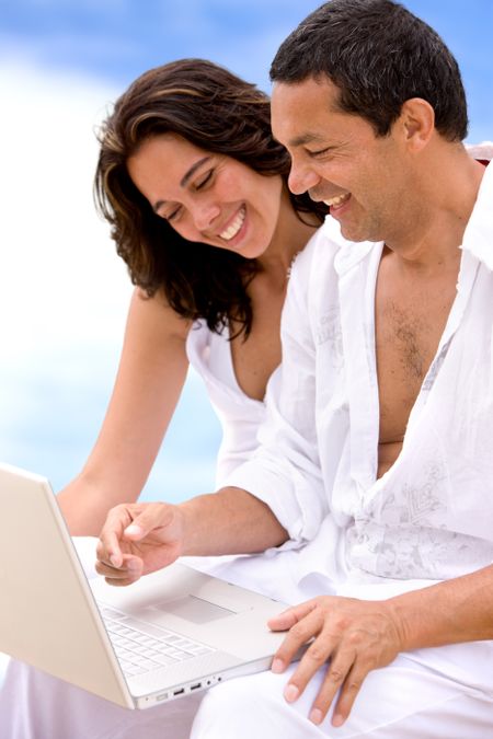 Beach couple on a computer smiling