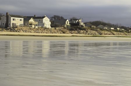 Beach landscape with long retaining wall near sunset across reflective tidal flats of Brewster, Massachusetts