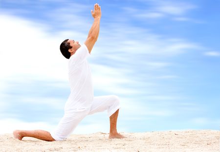 beach man doing yoga exercises in a tranquil location