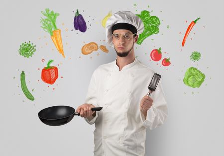 Bearded cook with colourful drawn vegetables on a white wallpaper