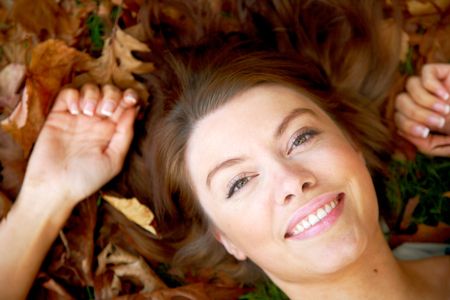 beautiful autumn woman smiling on the floor surrounded by leaves