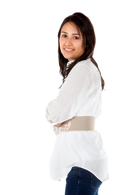 Beautiful casual woman smiling isolated over a white background