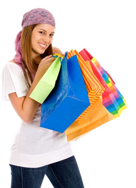 beautiful casual woman standing with shopping bags isolated over a white background