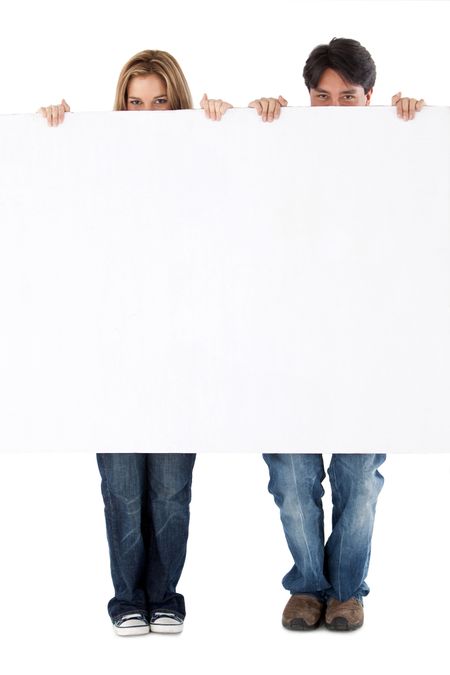 Beautiful couple displaying a banner ad isolated over a white background