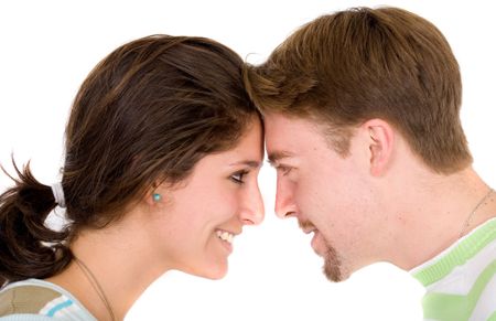 Beautiful couple face to face looking at each other smiling over a white background