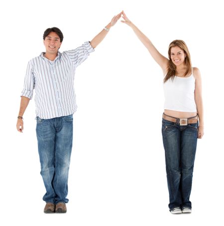 Beautiful couple portrait smiling with arms up and their hands together isolated over white