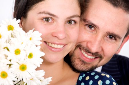beautiful couple portrait - both smiling with white flowers