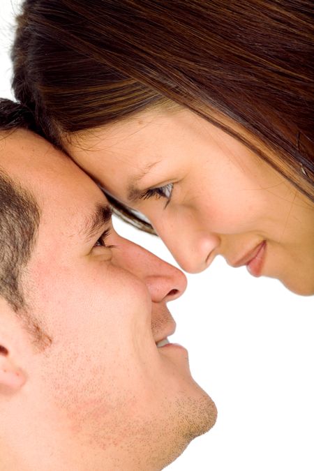 Beautiful couple smiling while facing at each other - isolated over a white background
