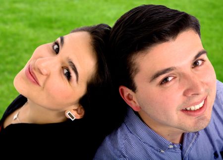 Beautiful couple smiling portrait - outdoors over a green grass background