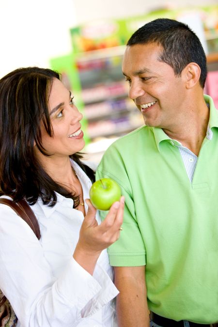 Beautiful couple smiling at a supermarket carrying shopping bags