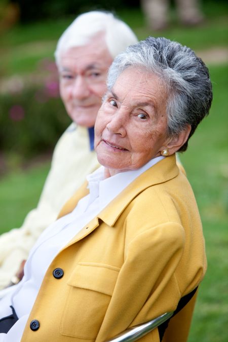 Beautiful elder couple sitting on a bench outdoors