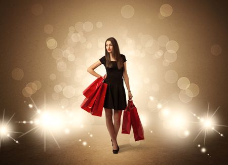 A beautiful elegant woman in black standing with red shopping bags in front of brown background and bright glowing lights concept