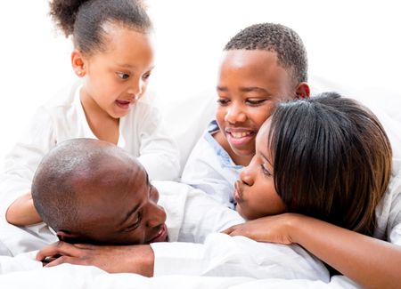 Beautiful family lying in bed and looking very happy