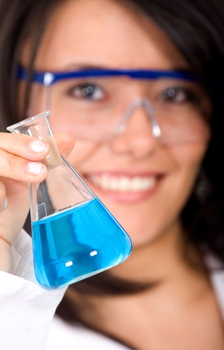 beautiful female scientist holding a bottle with cyan liquid