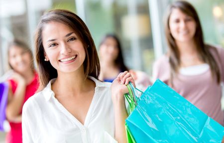 Beautiful female shopper holding bags and smiling