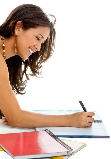 Beautiful female student looking happy isolated on white