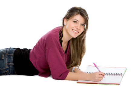 Beautiful female student lying on the floor with a notebook - isolated over white