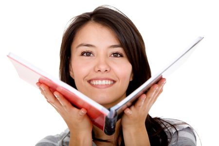 Beautiful female student with a notebook isolated