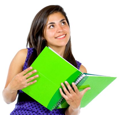 Beautiful female student with a notebook isolated over a white background