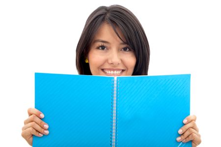 Beautiful female student with a notebook isolated over a white background