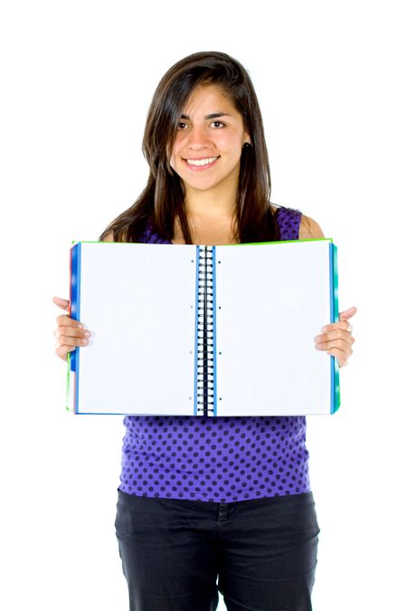 Beautiful female student with an open notebook isolated over a white background